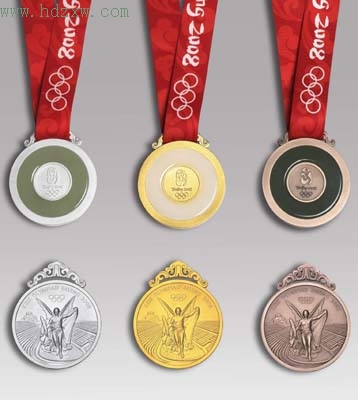 北京2008年奥运会奖牌直径为70毫米,厚6毫米。奖牌正面为国际奥委会统一规定的图案——插上翅膀站立的希腊胜利女神和希腊潘纳辛纳科竞技场。奖牌背面镶嵌着取自中国古代龙纹玉璧造型的玉璧,背面正中的金属图形上镌刻着北京奥运会会徽。奖牌挂钩由中国传统玉双龙蒲纹璜演变而成。整个奖牌尊贵典雅,中国特色浓郁,既体现了对获胜者的礼赞,也形象诠释了中华民族自古以来以“玉”比“德”的价值观,是中华文明与奥林匹克精神在北京奥运会形象景观工程中的又一次“中西合璧”。北京2008年奥运会奖牌的挂钩设计由我国传统玉双龙蒲纹璜演变而成,背面镶玉设计的灵感来自我国古代的佩玉 。 北京2008年残奥会奖牌正面镶玉的设计灵感来自中国古代的玉器造型,中间为北京2008年残奥会会徽;玉的色泽随金、银、铜牌有所变化,分别为:白玉、青白玉、青玉。奖牌背面图案为国际残奥委会会徽和运动项目名称,以及“北京2008年残奥会”的中英文及盲文。残奥会比赛项目冠军和亚军的奖牌质地为纯银,冠军奖牌还要镀有不少于6克的纯金。北京残奥会奖牌将玉嵌入其中,这一设计不仅符合国际残奥委会的相关规定,其设计创意、造型也与北京2008年奥运会奖牌相呼应,体现了健全人与残疾人彼此平等,相互尊重,无论是奥运会奖牌,还是残奥会奖牌都具有相同的价值与无上荣誉,是“同一个世界 同一个梦想”的最好体现。