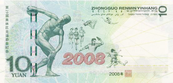 中国人民银行定于2008年7月8日发行第29届奥林匹克运动会纪念钞一张。纪念钞面额为10元,主色调为蓝绿色,票幅长148.5毫米,宽72.0毫米。 该纪念钞正面主景图案为北京2008年奥林匹克运动会主会场——国家体育场,其上方为第29届奥林匹克运动会会徽图案,背景为天坛图案。票面左上角为光彩光变面额数字“10”,其下方为国家体育场水印图案;票面左下方为盲文面额标记,全息定位镂空标志,双色接线异型号码;票面右侧自上而下分别为中华人民共和国国徽图案,凹印手感线,面额数字“10”与“拾圆”字样。 纪念钞背面主景图案为古希腊雕塑“掷铁饼者”、运动员群像图案及“2008”字样。主景图案下方为年号“2008”及行长印章。票面左侧为“第29届奥林匹克运动会纪念”、面额数字“10”、汉语拼音“YUAN”字样及光变全息开窗安全线;票面右上方为“中国人民银行”汉语拼音行名及蒙、藏、维、壮四种民族文字的“中国人民银行”字样和面额。 全球发行600万张!